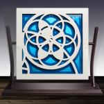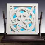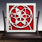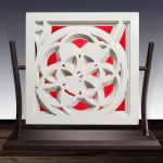 Designed after the architectural Gothic Rose Window, this rich, rusted sculpture is available in 3 versions. Each shows a lacy, multi-layer, delicate pattern, and highlights the layer of brilliant art glass. Select White & Red or White & Blue, with a contrasting pattern from front to back.