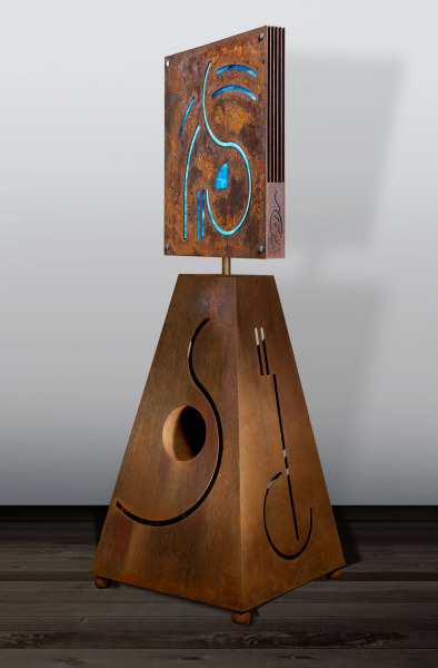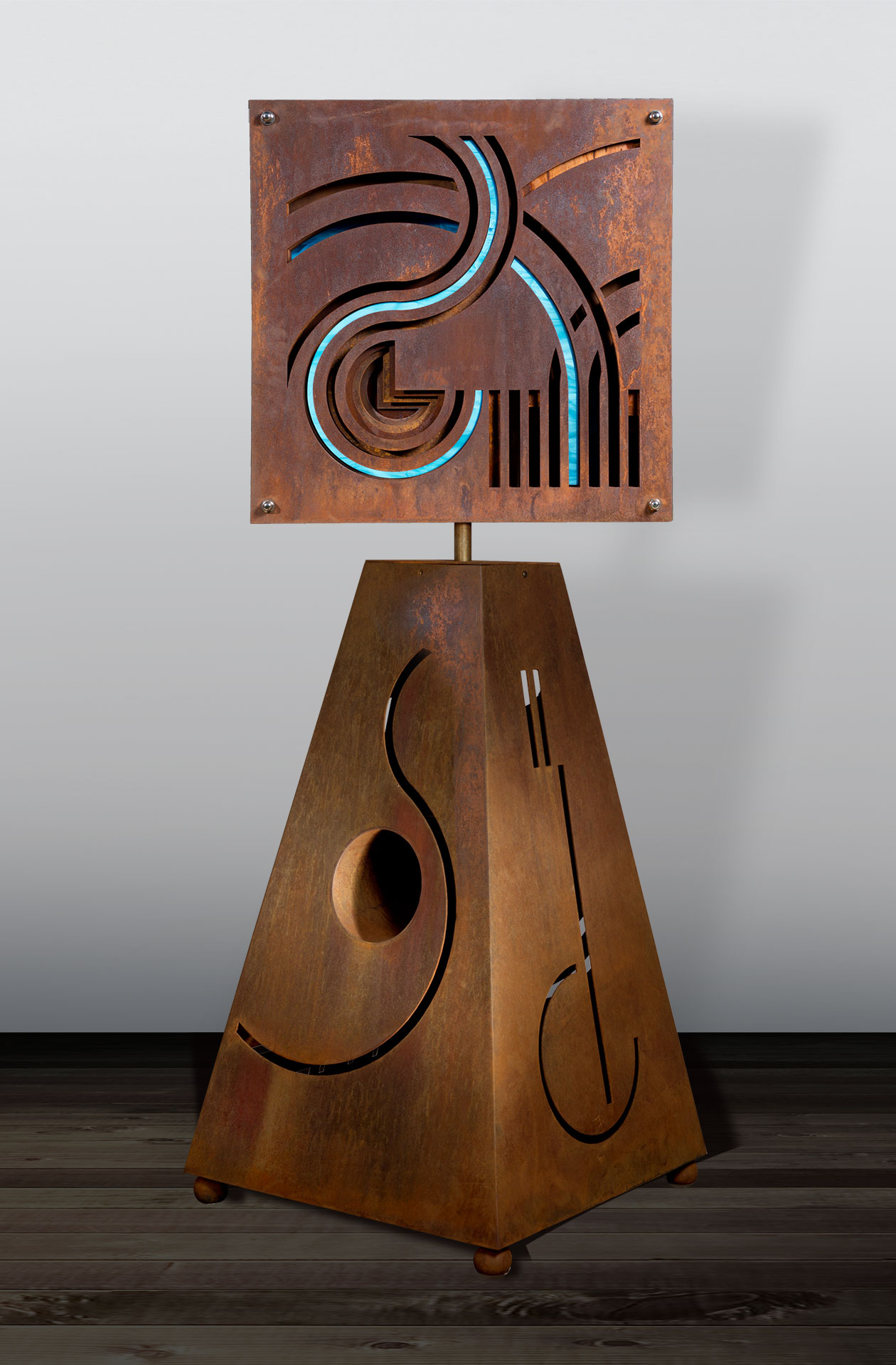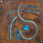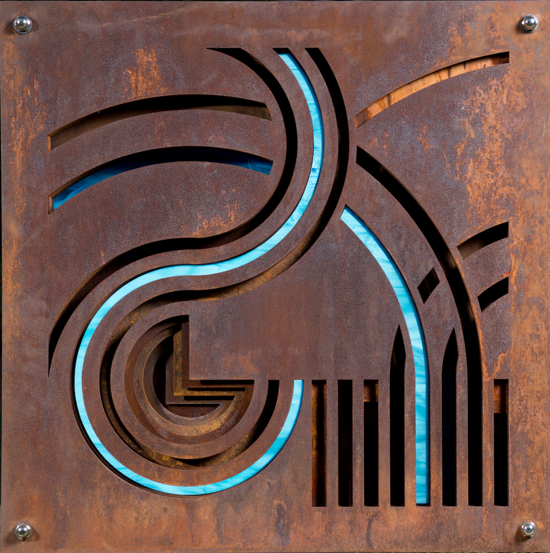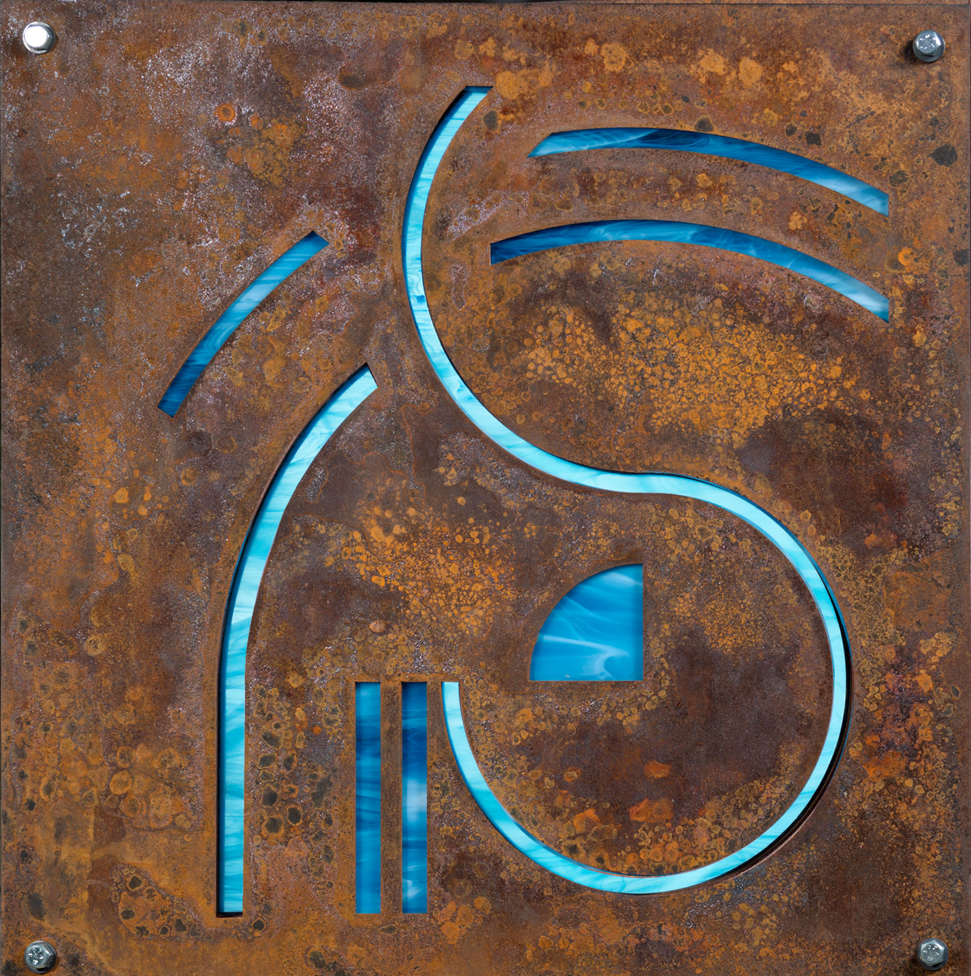 Limited Edition (3) / CorTen steel, rust patina, float glass, 360° stainless steel pivot ~ 54" x 24"