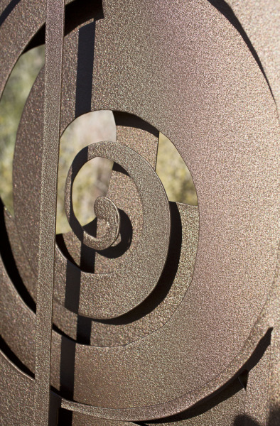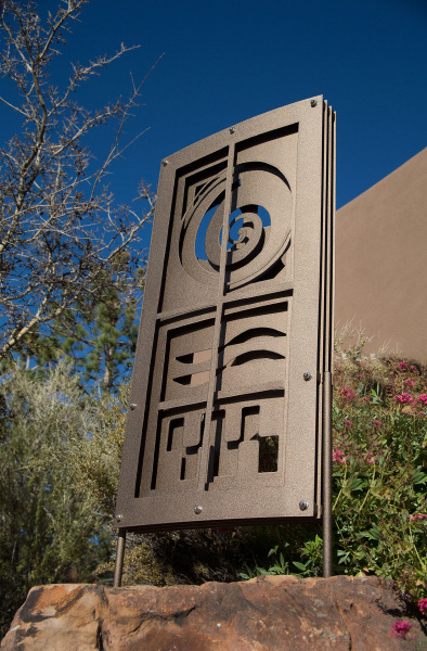 Steel, powder coat, mounted on boulder ~ 55" x 25" (64" H on boulder base)