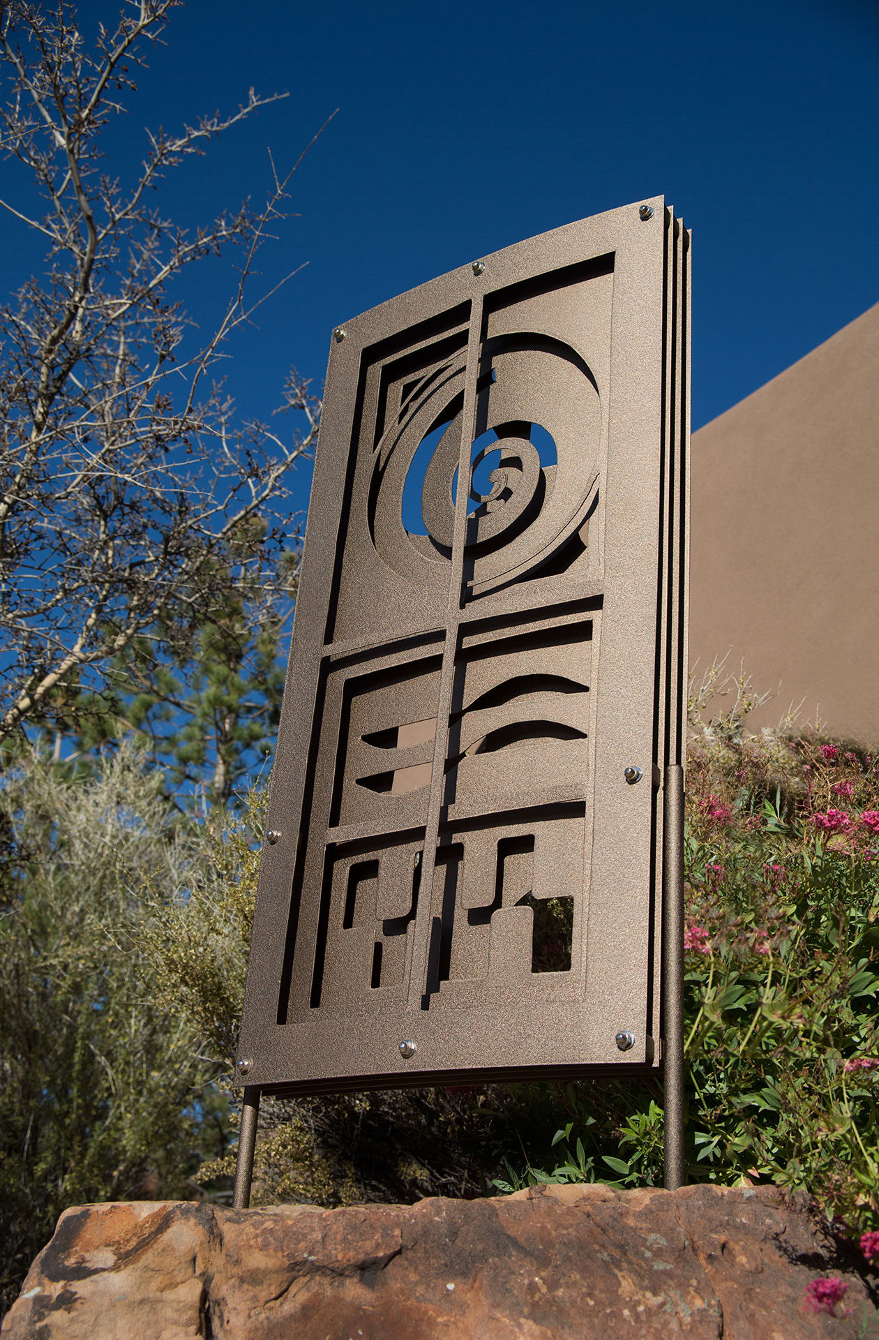 The scene seen through my studio window. The first layer of the steel sculpture divides four window panes, followed by a sky filled with symbols of my own design for sun, wind, clouds and rain expressed in a warm southwestern motif.