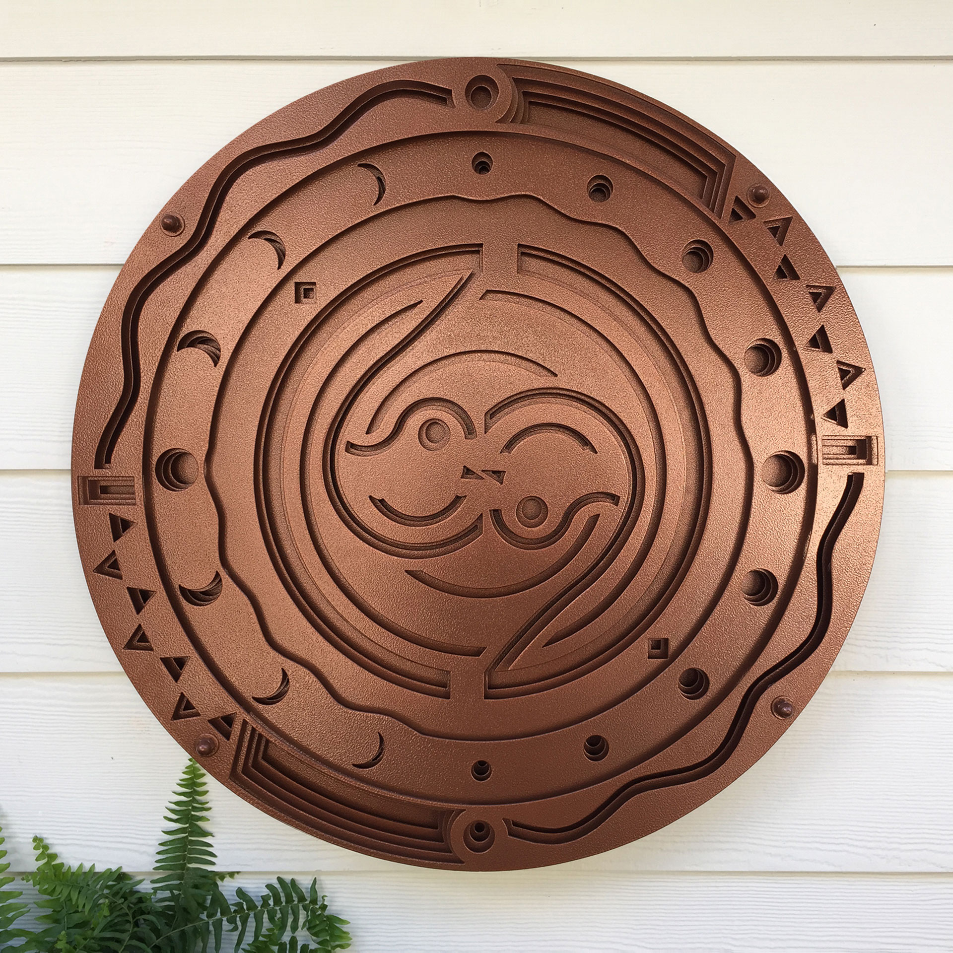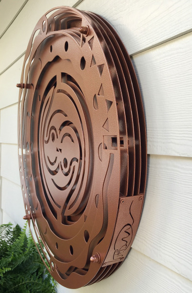 Steel, copper powder coat, mounted on patio wall ~ 30" Diameter