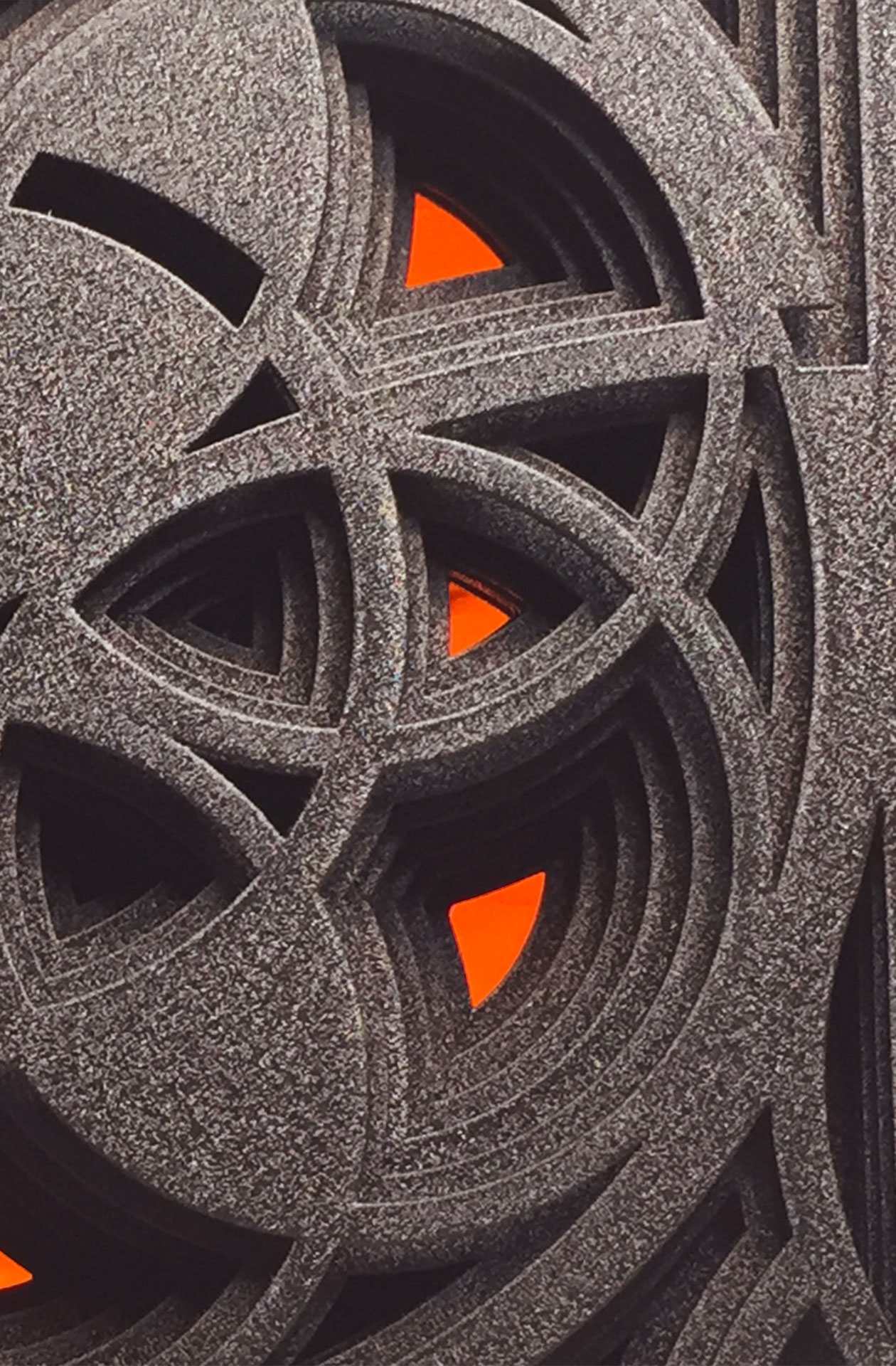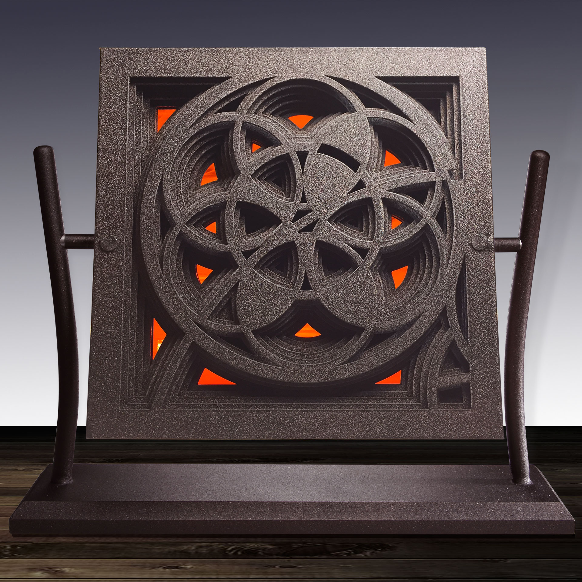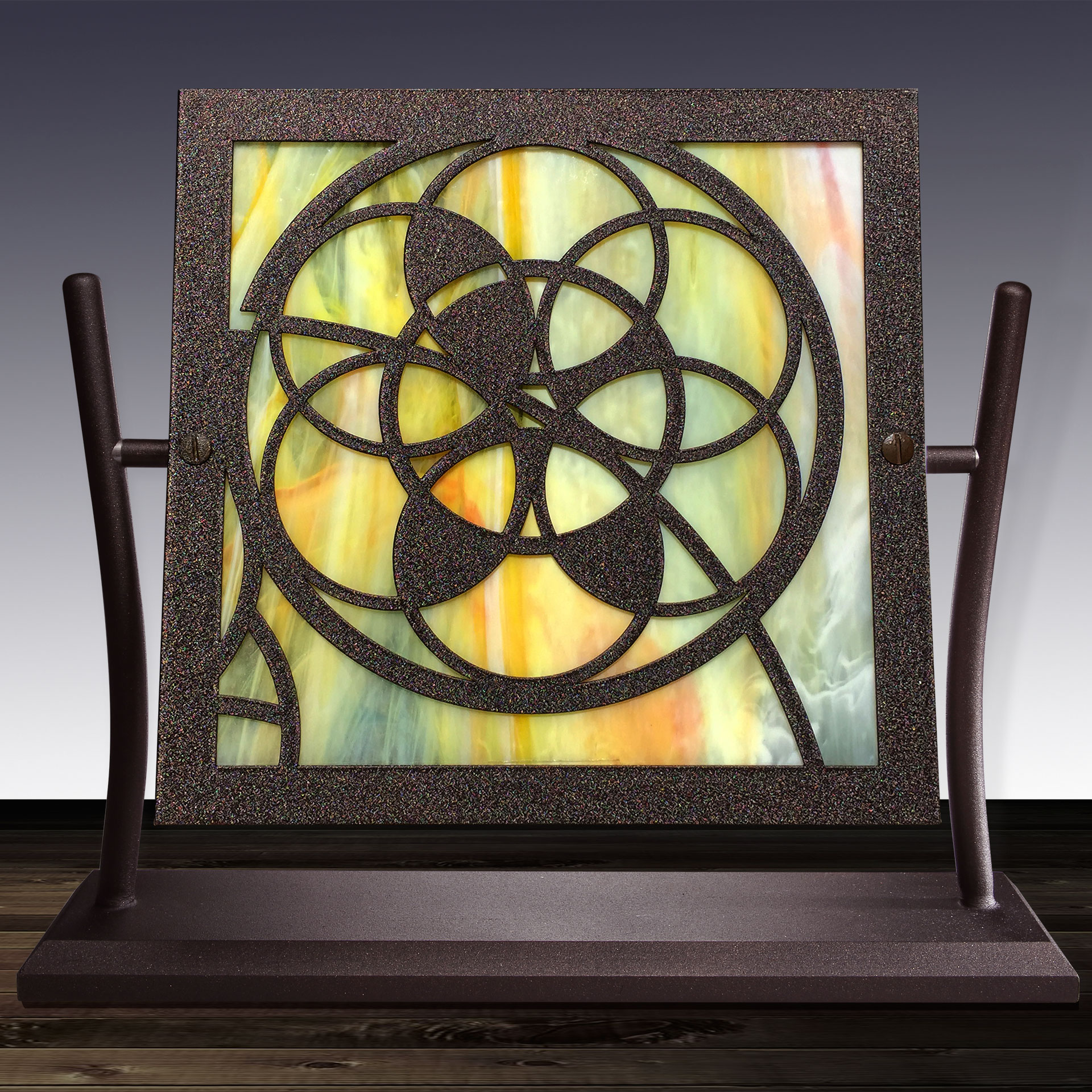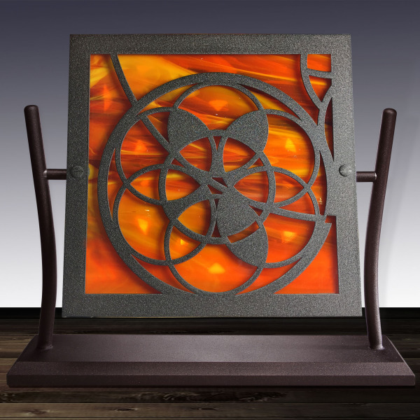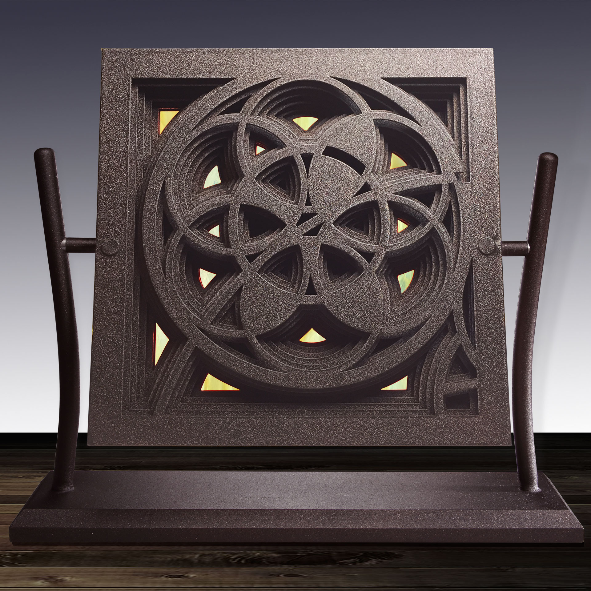 Designed after the architectural Gothic Rose Window, this rich, rusted sculpture is available in 3 versions. Each shows a lacy, multi-layer, delicate pattern, and highlights the layer of brilliant art glass. Select Bronze & Yellow or Bronze & Orange, with a contrasting pattern from front to back.